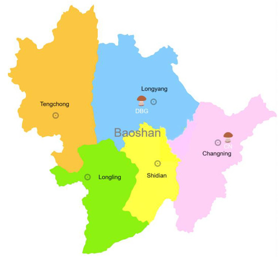 On 18 July 2024, B. roseoflavis samples were collected from two locations in Baoshan, Yunnan Province—Dabaogai (BDG; 25°12′ N, 99°12′ E) and Changning (CN; 24°86′ N, 99°67′ E) (Figure 2). Maturity was determined based on the color, shape, and size of the fruiting bodies. At each site, three samples of the same maturity stage were harvested and immediately preserved in liquid nitrogen for subsequent analysis.