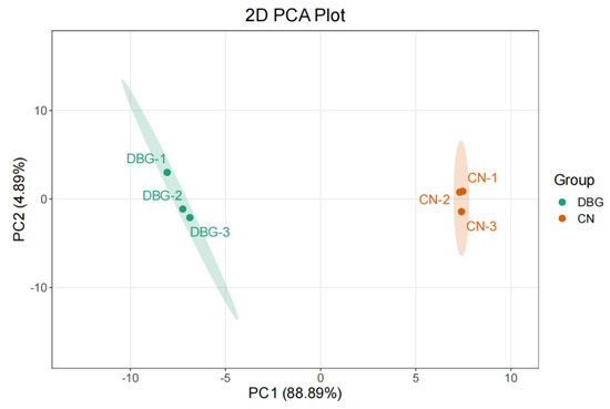 PCA can be used to identify the overall metabolic differences and variability between sample groups. As shown in Figure 6A, the grouping ellipses of B. roseoflavus metabolites separated from the two regions were plotted. The contribution of PC1 was 71.03%, and PC2 was 8.92%. The clear trend in sample separation indicates significant differences between the samples. The total amount of non-volatile metabolites in DBG and CN was similar (Figure S3B). However, the levels of amino acids and their derivatives, organic acids, and alkaloids were higher in DBG than in CN, while the levels of benzene and its derivatives, lipids, nucleotides and derivatives, alcohols, amines, phenolic acids, heterocyclic compounds, flavonoids, and terpenes were lower in DBG than in CN. A total of 2351 metabolites were identified in B. roseoflavus, including 20.51% amino acids and their derivatives, 20.26% organic acids, 8.97% lipids, 8.85% benzene and its substituted derivatives, 7.18% nucleotides and derivatives, 3.72% alkaloids, 3.33% flavonoids, 3.21% phenolic acids, 2.95% terpenes, 2.18% total proteins, 1.92% alcohols and amines, 1.92% heterocyclic compounds, and 1.03% lignans and coumarins.