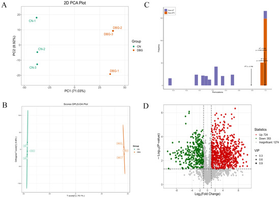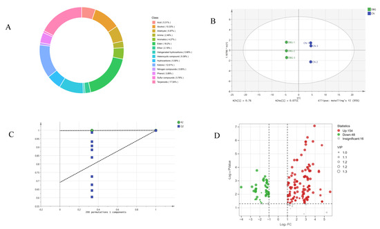 Comprehensive analysis of volatile metabolites: (A) volatile metabolite species; (B) scatter plot of scores from the orthogonal partial least squares discriminant analysis (OPLS-DA) model; (C) results of the 200-permutation test; and (D) volcano plot of differential metabolites.