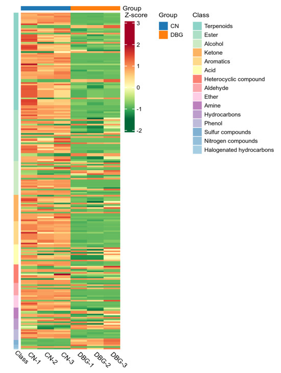 To further analyze the characteristic aroma substances of CN and DBG, differential metabolites were selected based on VIP > 1, fold change ≥ 2, and fold change ≤ 0.5. A total of 218 differential metabolites were screened, and the volcano plot (Figure 4D) showed that 154 metabolites were significantly upregulated and 48 metabolites significantly downregulated. The heat map of differential metabolite clustering (Figure 5) revealed that the three largest categories of volatile substances were terpenes, aldehydes, and alcohols. In fungi, terpenes are synthesized via the mevalonate (MVA) pathway, which uses acetyl-CoA as the starting substrate [36]. Aldehydes are an important class of volatile components in edible fungi, contributing green, fatty, almond, and waxy aromas [39]. Alcohols primarily provide a mushroom-like and green aroma, mainly produced via the fatty acid pathway. For example, octenol is formed during the oxidative decomposition of linoleic acid [40].