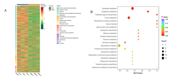 OPLS-DA was used to screen the metabolites corresponding to the differences between the two groups (Figure 6B,C). In our study, the R2X value was 0.786, the R2Y value was 1, and the Q2 value was 0.988, indicating that the OPLS-DA model is stable. Using VIP > 1, fold change ≥ 2, and fold change ≤ 0.5 as the selection criteria, 1226 non-volatile differential metabolites were identified between DBG and CN, with 724 metabolites upregulated and 353 metabolites downregulated (Figure 6D). To better visualize the relative content of these metabolites from different geographical sources of B. roseoflavus, a heatmap analysis was performed (Figure 7A). The higher the brightness of orange in the figure, the higher the abundance of metabolites, while the higher the brightness of green, the lower the abundance of metabolites. The difference in brightness between these colors helps us visually distinguish the differences between different groups more quickly. The results showed that the abundance of differential metabolites in CN was significantly higher than that in DBG.