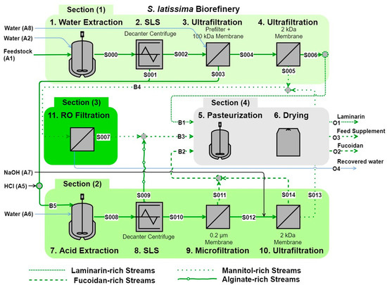 - Zhang, X.; Thomsen, M. Techno-economic and environmental assessment of novel biorefinery designs for sequential extraction of high-value biomolecules from brown macroalgae Laminaria digitata, Fucus vesiculosus, and Saccharina latissima. Algal Res. 2021, 60, 102499. [Google Scholar] [CrossRef]