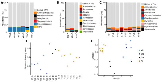Relative abundance of bacterial genera, alpha and beta diversity across the samples. (A) Water collected inside (Wi) and outside (Wo) the fishing cages of farms A, B, and C. (B) Fish containers from farms A, B, and C. (C) Fish samples. Genera representing less than one percent of the sample were grouped together and labeled as “Genus < 1%”. (D) Shannon diversity index. (E) Non-metric multidimensional scaling (NMDS) based on Bray–Curtis dissimilarity matrix showing stress value of 0.06.