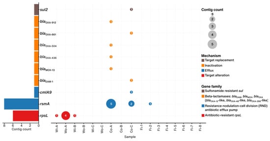 ARGs were detected across all sample types (Figure 2). The rpsL gene, belonging to the antibiotic-resistant rpsL family, was found exclusively in water samples. Sample Wo-A exhibited the highest abundance of this gene, presented in four contigs, whereas samples Wi-A and Wi-B each contained a single instance. Container samples revealed a broader range of ARGs, including the rsmA gene, associated with the resistance-nodulation-cell division (RND) antibiotic efflux pump family. This gene was the most prevalent, particularly in sample Co-A. Additional ARGs detected in container samples included beta-lactamase genes, such as blaOXA variants (blaOXA-436 [blaOXA-48-like], blaOXA-504, blaOXA-661 [blaOXA-266-like], and blaOXA-912 [blaOXA-12-like]), as well as MOX-13 and EAM-1. ARGs with low abundance, including cmlA9 and sul2, were also found in these samples. In contrast, fish samples showed low ARG diversity, in which only sample Fi-2 contained rsmA.