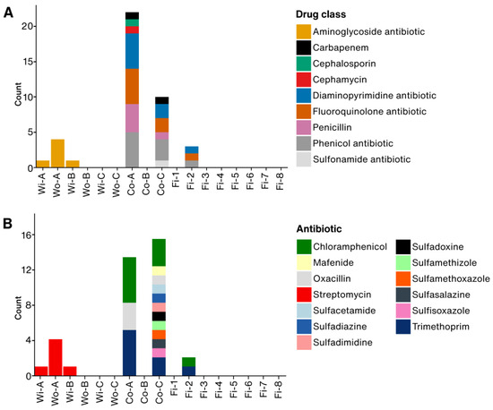 Distribution of antibiotic-resistance-genes (ARGs) annotations in the metagenomic contigs recovered from each sample based on (A) drug class and (B) specific antibiotics. For every contig that matched an ARG entry in the Comprehensive Antibiotic Resistance Database, we extracted the full list of drug classes and antibiotic names reported. Each unique combination adds one to the appropriate bar. Consequently, a single gene contig can contribute to several drug-class bars in panel A and several antibiotic bars in panel B.
