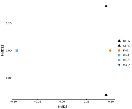 The NMDS analysis based on Bray–Curtis distances revealed clustering patterns of ARG gene families across different samples (stress = 0.0; PERMANOVA, p = 0.1). ARGs detected in water samples (Wi-A, Wi-B, and Wo-A) clustered together, whereas container samples (Co-A and Co-C) and fish samples (Fi-2) formed a separate cluster (Figure 4).