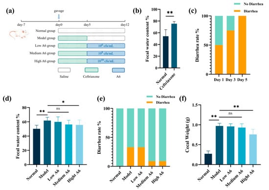 Effects of A6 on diarrhea indexes in AAD mice: (a) study design; (b) changes in fecal water content in mice between the normal group (n = 12) and the ceftriaxone-treated group (n = 48); (c) changes in the diarrhea ratio during ceftriaxone treatment; (d) changes in the fecal water content of mice in different treatment groups on day 12 (n = 12); (e) changes in the diarrhea ratio of mice in different treatment groups on day 12 (n = 12); (f) weight of the mouse cecum (n = 12). The error bar represents the mean ± SE. Means marked with asterisks are significantly different (* p < 0.05; ** p < 0.01; ns p > 0.05).