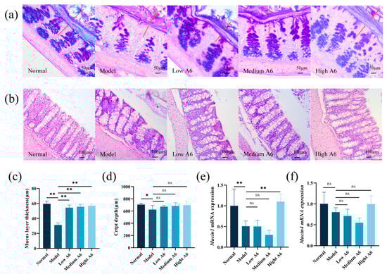 A6 enhanced the mucus barrier and the expression of mucin-forming genes in AAD mice: (a) AB-PAS staining of proximal colon tissues (magnification: 40 × 5; red arrows: colonic mucus layers); (b) HE staining of colon tissues of mice in different treatment groups in the recovery period (magnification: 20 × 5); (c) effect of A6 intervention on the thickness of the mucinous layer in the proximal colon of mice (n = 6); (d) effect of A6 intervention on the depth of crypts in the colon of mice (n = 6); (e,f) Mucin1 and mucin4 gene expression in mice in different treatment groups (n = 6). The error bar represents the mean ± SE. Means marked with asterisks are significantly different (* p < 0.05; ** p < 0.01; ns p > 0.05).