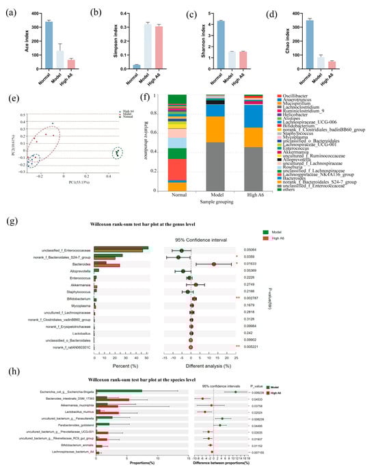 Effects of A6 on the intestinal microbiota of AAD mice: (a–d) alpha diversity analysis; (e) UniFrac PCoA analysis of the intestinal microbiota of mice in different treatment groups; (f) species relative abundance at the genus level in different groups; (g,h) differential microorganisms at the genus and species levels between the model group and the high-dose A6 group. The error bars represent the mean ± SE, n = 6. Means marked with asterisks are significantly different (* p < 0.05; ** p < 0.01).