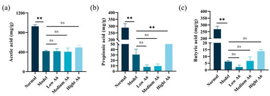 Level of SCFAs in the feces of each group: (a) acetic acid content (mg/g); (b) propionic acid content (mg/g); (c) butyric acid content (mg/g). The error bars represent the mean ± SE, n = 6. Means marked with asterisks are significantly different (** p < 0.01; ns p > 0.05).