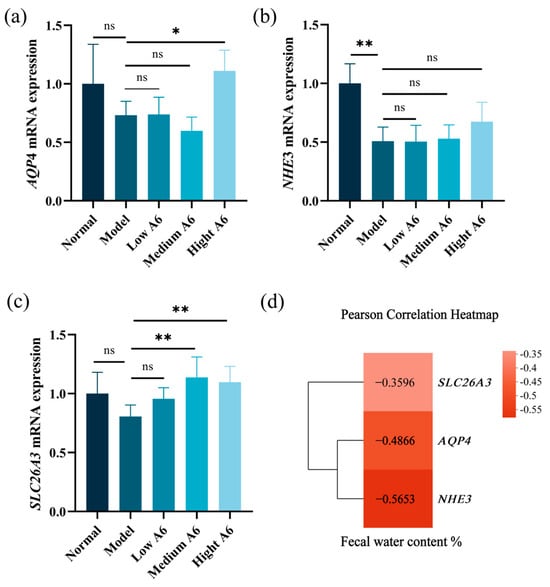 Water and electrolyte transport gene expression of mice in different treatment groups. (a–c) The mRNA expression of AQP4, NHE3, and SLC26A3; (d) Pearson correlation heatmap between gene expression levels and fecal water content. The error bars represent the mean ± SE, n = 6. Means marked with asterisks are significantly different (* p < 0.05; ** p < 0.01; ns p > 0.05).
