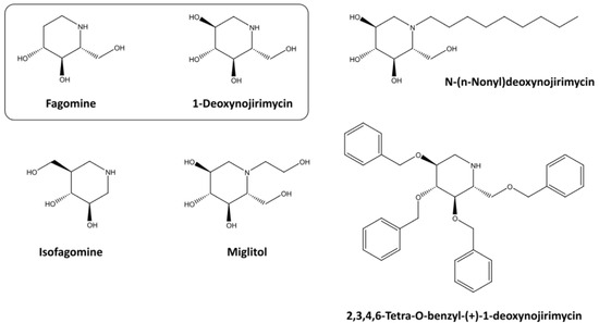 Differences in chemical structure between natural iminosugars (boxed) and their synthetic derivatives. Isofagomine is derived from Fagomine, while 1-Deoxynojirimycin serves as the core for the synthetic derivatives Miglitol (Glyset®), N-(nonyl)deoxynojirimycin, and 2,3,4,6-Tetra-O-benzyl-(+)-1-deoxynojirimycin.