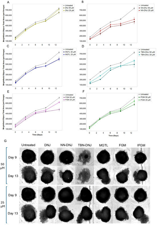 Effects of treating HCT-116 cells with iminosugars on spheroid growth over time. (A–F) The graphs represent growth curves of cells when treated with the iminosugars (A) DNJ; (B) NN-DNJ; (C) TBN-DNJ; (D) MGTL; (E) FGM; and (F) IFGM; or untreated, over a time frame of 0 to 13 days, obtained using the IncuCyte live-cell imaging system, which captures phase-contrast images over time. The images depict spheroids on days 9 and 13 after treatment with either 50 μM or 25 μM iminosugar (G). The images illustrate the evolution over time of the morphology and cellular density of the spheroids.