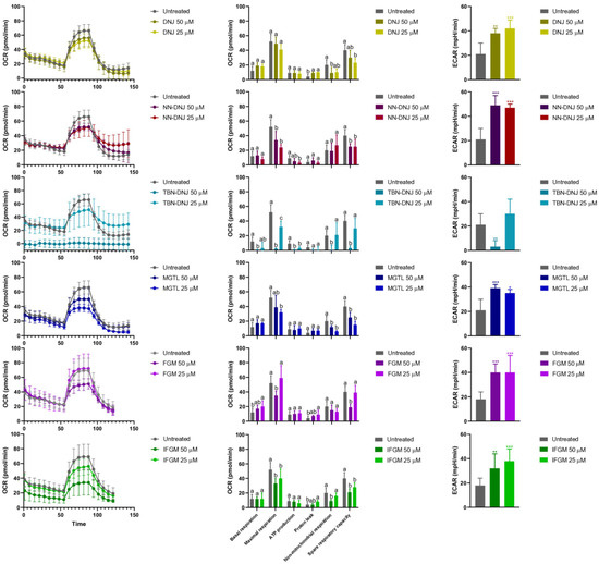 The effect on energy production, as determined by the XFe96 Efflux Analyzer (Agilent Technologies, Diegem, Belgium), is given for the treatment of cells with 50 μM or 25 μM iminosugar. Left panels show OCR as a function of time and upon different stressor injections. The middle panels show various mitochondrial parameters. Basal respiration refers to mitochondrial activity at rest. Maximal respiration after the injection of FCCP, an uncoupling agent that forces the electron transport chain to work at its full capacity, indicates mitochondrial reserve capacity. Mitochondrial ATP production is the difference between basal respiration and the OCR after OM inhibition of the ATP synthase. Proton leakage is the residual OCR after OM addition, and it reflects oxygen consumption not linked to ATP production but rather due to proton leakage across the mitochondrial membrane. Non-mitochondrial respiration is the OCR after the complete inhibition of the electron transport chain by R/AM and reflects oxygen consumption by non-mitochondrial sources (e.g., oxidases or peroxisomes). Spare respiratory capacity is the difference between maximal and basal respiration, representing the highest possible reserve capacity upon elevated energy demand. A low value may indicate that cells are already operating near their respiratory limit, making them more vulnerable to stress. On the right, ECAR in spheroids after 13 days of treatment is depicted. Data are presented as mean ± standard deviation. Mean values marked with different letters (i.e., a, b, c) for each mitochondrial parameter indicate significant differences (p < 0.05) among treatments, as determined by one-way ANOVA followed by Tukey’s HSD post hoc test. Statistical difference is marked by ***: p < 0.001, **: p < 0.01, *: p < 0.05 compared with control by ANOVA followed by Tukey’s HSD post hoc test.