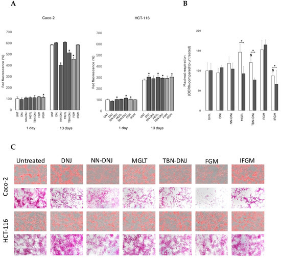 In particular, this study demonstrates that iminosugars alter cell growth in colon cancer Caco-2 and HCT-116 cells in a sugar- and environment-specific way, reducing their basal respiration and spare mitochondrial capacity while increasing glycolysis and lactate production. Moreover, long-term treatment induces changes in the substrate preferences for energy metabolism and alters lipid and glycogen deposits in intestinal monolayers. These changes in nutrient deposits are accompanied by alterations in tissue organization.
