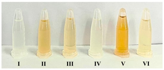 The enzymolysis liquids of Flounder steak. I. The Control, II. neutrase group, III. acid protease group, IV. papain group, V. flavourzyme group, and VI. alcalase group.