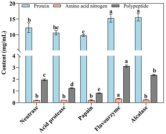 Effects of different proteases on protein, amino acid nitrogen, and polypeptide in enzymolysis liquids of Flounder steak (n = 3). Significant differences in the same index are indicated by different lowercase letters (a–e) (p < 0.05).