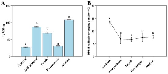 The T-AOC (A) and DPPH radical scavenging ability (B) of Flounder steak enzymatic hydrolysates (n = 3). Significant differences in the same index are indicated by different lowercase letters (a–e) (p < 0.05).