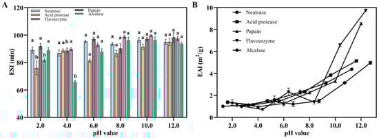 The ESI (A) and EAI (B) of various Flounder steak enzymatic hydrolysates. There were significant differences in the same index by different lowercase letters (a and b) (p < 0.05).