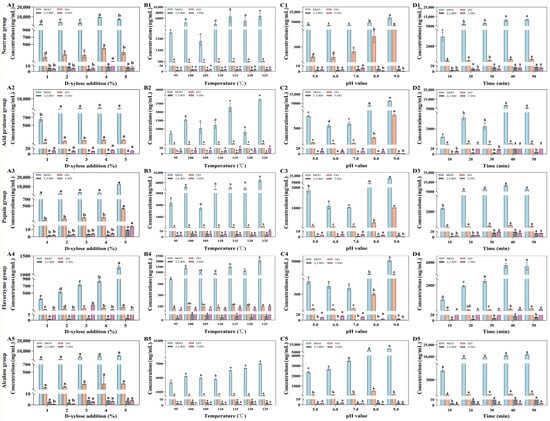 The effects of various MR parameters on the contents of MGO, GO, 2,3-BD, and 3-DG are shown in Figure 5. D-xylose is a common reducing sugar used in thermal food processing to facilitate the MR. D-xylose at concentrations of 1%, 2%, 3%, 4%, and 5% was added to 50.00 mL of 20.00 mg/mL Flounder steak enzymolysis liquids (pH 8.5), and the mixture was reacted at 105 °C for 25 min. With the concentrations of D-xylose increased from 1% to 4%, the degree of MR became more intense, which caused an increase in the total concentrations of MGO, GO, 2,3-BD, and 3-DG in all groups (Figure 5(A1–A5)). When the concentration of D-xylose reached 5%, the total concentrations of four α-DCCs continued to increase in the papain, flavourzyme, and acid protease groups (from 3432.70 μg/mL, 946.95 μg/mL, and 5295.82 μg/mL to 12,640.93 μg/mL, 1328.53 μg/mL, and 5606.79 μg/mL, respectively), primarily due to the increasing formation of MGO through MR. In contrast, the contents of four α-DCCs in the alcalase and acid protease groups decreased compared to those at a D-xylose concentration of 4%. In addition, after MR, the total concentration of MGO, GO, 2,3-BD, and 3-DG in the flavourzyme group was the lowest. The amounts of 2,3-BD and 3-DG increased less distinctly compared to those of MGO and GO. So, the concentration of D-xylose in MR should be kept below 4%. Meanwhile, the reducing capacity of the enzymatic hydrolysates might contribute to decreasing the concentrations of α-DCCs.