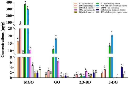 Quantification of MGO, GO, 2,3-BD, and 3-DG in 10 commonly available seafood condiments on the market (n = 3). Significant differences in the same index are indicated by different lowercase letters (a–f) (p < 0.05).