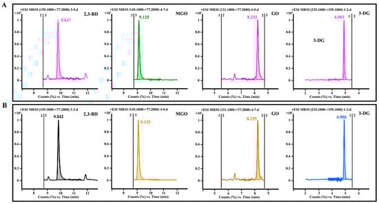LC-MS/MS chromatograms of MGO, GO, 2,3-BD, and 3-DG in seafood condiments prepared using enzymolysis liquids: (A) flavourzyme group and (B) papain group.