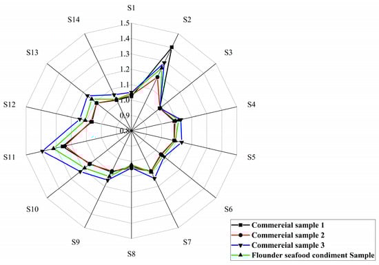 The electronic nose data showed that the optimal Flounder seafood condiment exhibited a similar odor profile to the commercial products, with an overall odor intensity higher than that of the market products. The intensity of sulfides in Flounder seafood condiment (Figure 8 S2 sensor) was intermediate in flavor, originating from the breakdown of sulfur-containing amino acids and contributing a certain spoilage odor to the product. The Flounder seafood condiment sample demonstrated significantly higher intensities for alkanes, alcohols (Figure 8 S11 sensor), and cooking smells (Figure 8 S13 sensor) compared to market products. These compounds were primarily the final products of the MR and high-temperature decomposer of organic matter. Amines, which are commonly associated with microbial spoilage and volatile organic compounds derived from fossil fuels (Figure 8 S1 sensor), showed lower levels in the Flounder seafood condiment. The results demonstrated that the optimal Flounder seafood condiment formulation, incorporating MR product from the flavourzyme group, possessed excellent quality and was suitable for the preparation of commercial Flounder seafood condiments.