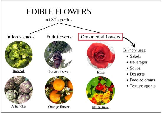 The flowers that are considered edible include approximately 180 species [22]. This large number comprises a wide variety of flowers, which can be categorized in different ways. One classification of edible flowers can be into fruit flowers (e.g., citrus or banana flowers) and non-fruit (or ornamental) flowers (e.g., hibiscus, begonias, and calendula) [8,23]. Additionally, some foods considered vegetables are actually inflorescences (e.g., artichoke, broccoli, and cauliflower) [3]. Figure 1 shows the different types of edible flowers. In this review, only ornamental flowers will be discussed.