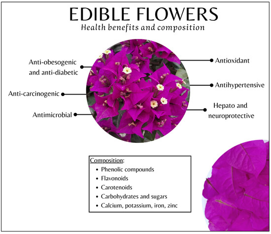 Current food trends include the search for products perceived as ‘natural’ and with certain health-promoting properties [1,2,3]. In addition, plant-based foods have also become more popular in recent years [1]. Part of these trends can include edible flowers, considered as those flowers that are harmless and safe to eat and that bring positive health effects to the human being [4,5]. Edible flowers have been used since ancient times by different cultures for various purposes, including nutritional value, medicinal properties, sensory qualities, and ornamental value [6,7]. Although these are foods with a long history of use, recent years have seen a resurgence in the consumption of edible flowers [6,8,9]. In some countries, it is possible to purchase edible flowers in various kinds of shops, including supermarkets and health food stores, while in other nations the flower market is still limited to the production of ornamental ones [8,10].