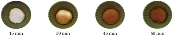 Thermal processing of the simplified multicomponent system was performed by baking in a laboratory oven at a temperature of 190 °C. The inner dimensions of the baking chamber were as follows: width 520 mm, height 455 mm, depth 340 mm. Duration of the preliminary baking experiment varied from 15 to 60 min. The experimental samples were baked in the middle part of the chamber after visual assessment of the overall appearance: placing the samples in the top oven resulted in quick deep darkening, while samples in the lower part remained pale and undercooked for a long time. The optimal duration of thermal processing in the middle oven was chosen by visual assessment of browning development.
