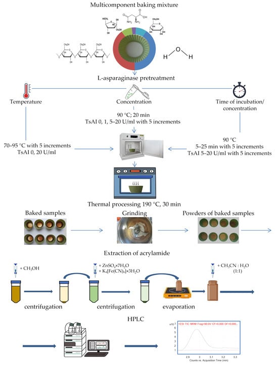To evaluate TsAI potential in reducing acrylamide content under various treatment conditions, experimental work was carried out according to the scheme presented in the Figure 2, which includes the above-described procedures for preparing food mixtures, thermal processing, extraction, and acrylamide detection.