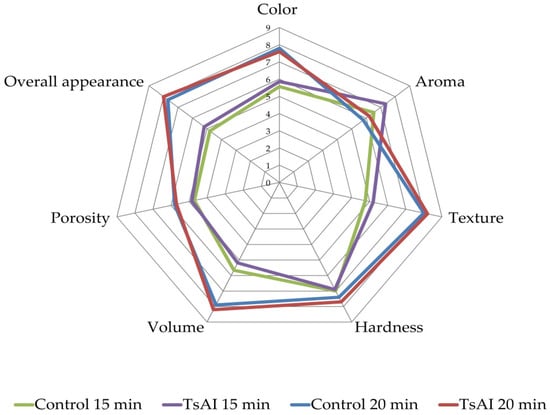 Our observations were confirmed by the results of sensory evaluation. Untrained participants representing typical consumers assessed characteristics of two groups of baked samples: 15 min pretreatment—control and TsAI-treated, 20 min pretreatment—control and TsAI-treated. Participants showed a greater preference for samples prepared with the 20 min pretreatment regimen, so a number of characteristics differed significantly between groups (Figure 3). Minor differences between enzyme-treated and untreated (control) samples within groups were not statistically significant (Table 1). The exception was the aroma for 15 min pretreatment samples: the TsAI-treated samples were significantly more preferable.