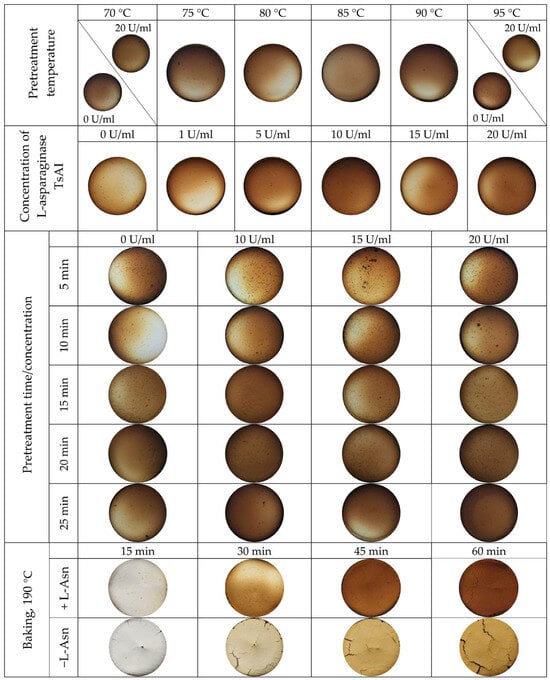 To prevent the Maillard reaction, L-asparaginase pretreatment of baking mixtures was performed by placing the molds in heating thermostat Julabo WS 100 (Julabo, Seelbach, Germany). Pretreatment was carried out by adding hyperthermophilic TsAI enzyme at a concentration of 1, 5, 10, 15, and 20 U/mL. An equal volume of water was added to the corresponding untreated samples, which served as control. Experiments were performed in the temperature range of 70–95 °C with 5 °C increments and process duration of 5–25 min with 5 min increments.