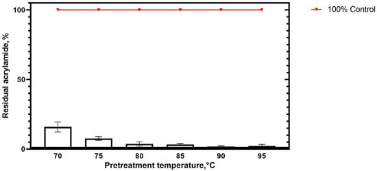 Acrylamide content was reduced in all samples pretreated with TsAI 20 U/mL at all temperatures tested compared to the respective controls (Figure 5). At 70 °C, residual acrylamide was estimated at 15.94% of the control value. The lowest residual acrylamide content was observed when TsAI pretreatment was carried out at 90 °C and 95 °C—1.76% and 2.33%, respectively, compared to the controls.