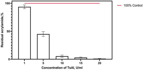 In an attempt to estimate TsAI working concentrations efficient enough to decrease acrylamide levels in foods, TsAI was added to samples at concentrations of 1, 5, 10, 15, and 20 U/mL. According to the experimental data, no significant differences in acrylamide content were observed between control samples and samples pretreated with TsAI at a concentration of 1 U/mL. A two-fold decrease in acrylamide level occurred when samples were pretreated with TsAI at a dosage of 5 U/mL. The residual acrylamide content gradually decreased to 5.49%, 3.01%, and 1.10% relative to control values with an increase in TsAI concentration to 10, 15, and 20 U/mL, respectively (Figure 6).