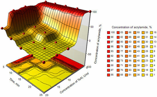 For short 5 min pretreatment, a high concentration of TsAI~18–20 U/mL is required (Figure 7). A fast two-fold decrease in acrylamide level compared to the control was observed for TsAI 20 U/mL, while lower TsAI concentrations were ineffective for a short 5 min treatment. Thus, samples pretreated with TsAI at a dosage of 10, 15, and 20 U/mL reduced acrylamide content by 2.82, 7.51, and 57.75% compared to control values, respectively, during 5 min incubation.