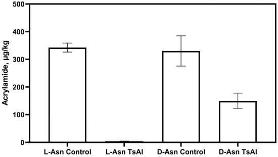 Thus, TsAI treatment did not affect sensory characteristics and color of the samples. These characteristics are one of the key factors that govern consumer behavior. Visual and olfactory perception of food is the first step of food quality assessment. On the other hand, it is known that the browning of bakery products and their flavor are also correlated with the intensity of the Maillard reaction [10], due to acrylamide formation. In this study, we can state that TsAI treatment did not impact color intensity, aroma, and overall appearance of baked samples (Figure 3 and Figure 4, Table 1 and Table 2). Nevertheless, simply excluding asparagine as a “fuel” for acrylamide formation from composition significantly decreased browning of samples (Figure 4).