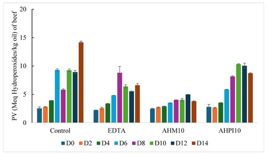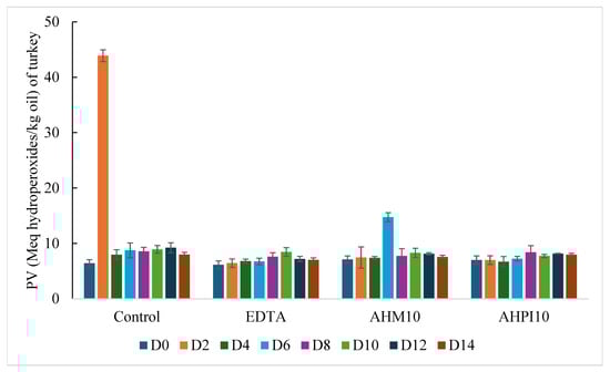 3.2. PV of Beef and Turkey Meatballs Under 14-Day Refrigerated Conditions