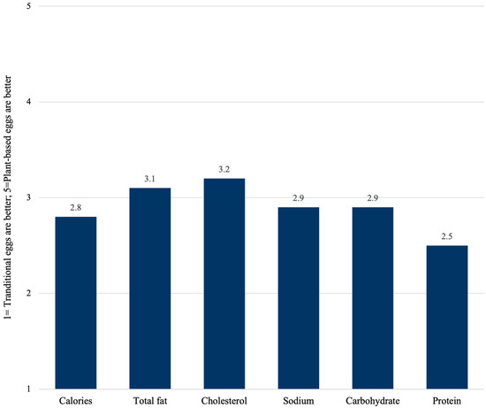 In terms of nutrition-related attributes, average scores hovered near the midpoint of the scale, indicating consumers view plant-based and traditional eggs as nearly equivalent on most nutrition attributes. Plant-based eggs were perceived as being slightly better than traditional eggs in terms of total fat and cholesterol. A review of plant-based products currently available on grocery store shelves confirms that claims such as “no cholesterol” or “cholesterol-free” are widely used to differentiate these products. A comparison of traditional and plant-based (vegan) eggs by Integris Health [44] confirms that plant-based eggs options are better than traditional eggs in terms of cholesterol and often better on fat content (especially saturated fat), but they can also be worse than traditional eggs on nutrients like sodium and may contain fewer vitamins and minerals.