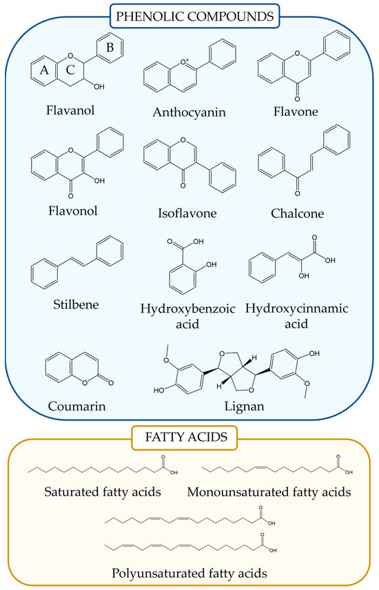 Chemical structure and examples of phenolic compounds and fatty acids.