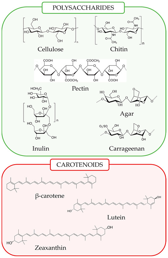 Chemical structure of some major examples of polysaccharides and carotenoids with beneficial health effects.