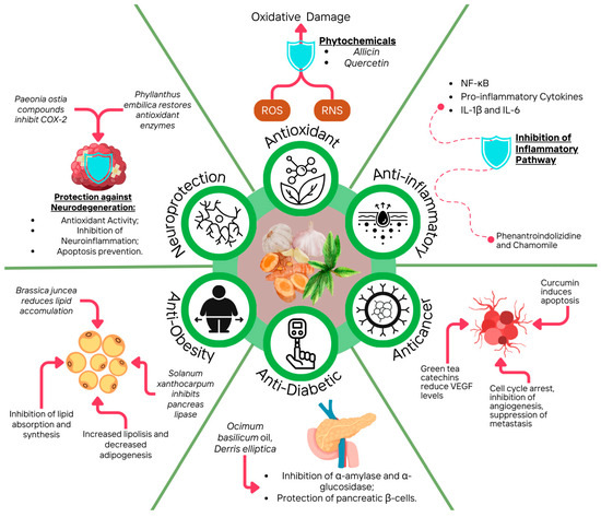 Diets rich in plant-based foods are generally associated with reduced cancer risk and all-cause mortality due to their related health benefits, including antioxidant, anti-inflammatory, antidiabetic, anti-obesity, and, potentially, anticancer effects (Figure 3). This suggests that dietary phytochemicals from various plant species hold potential for cancer chemoprevention [144]. This section will explore in vivo and in vitro studies on the biological properties of phytochemicals and other antioxidants from common and uncommon sources, highlighting their effects and mechanisms described (Table 2) [145].