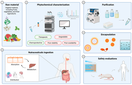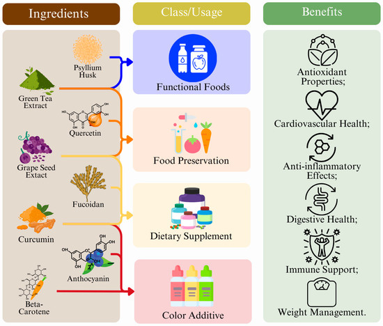 Key contributors to this activity include PCs, unsaturated fatty acids (UFAs), carotenoids, and polysaccharides, which are commonly isolated from plant-based matrices [6]. The growing recognition of these bioactivities has not only influenced dietary recommendations and favored increased consumption of fruits and vegetables, but it has also catalyzed the expansion of the nutraceutical sector. This industry now focuses on formulating products enriched with specific phytochemicals, such as purified phenolics, aimed at delivering targeted health benefits [7]. However, in recent decades, the interest in dietary phytochemicals has risen because they are thought to provide many health benefits, such as cardioprotection, neuroprotection, anti-inflammatory effects, and improved gut health, among others [2]. These effects are mainly attributed to the antioxidant properties of various groups of phytochemicals, with phenolic compounds, UFAs, and polysaccharides being chief among the key contributors [6]. Thus, diets rich in vegetables and fruits that may act as sources of phytochemicals have attracted more interest from researchers, industry, and society, with a focus on more conscious and healthy diets, as extensive research in the last decades has suggested that they are an overall healthy alternative [8,9].