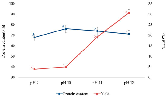 Effect of pH on protein content and yield. Values represent means of three independent determinations ± standard deviation. Different letters next to the data points indicate statistically significant differences at p ≤ 0.05.