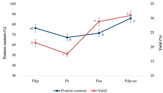 Impact of different pretreatments on protein content and yield. Values represent means of three independent determinations ± standard deviation. Different letters next to the data points indicate statistically significant differences at p ≤ 0.05.
