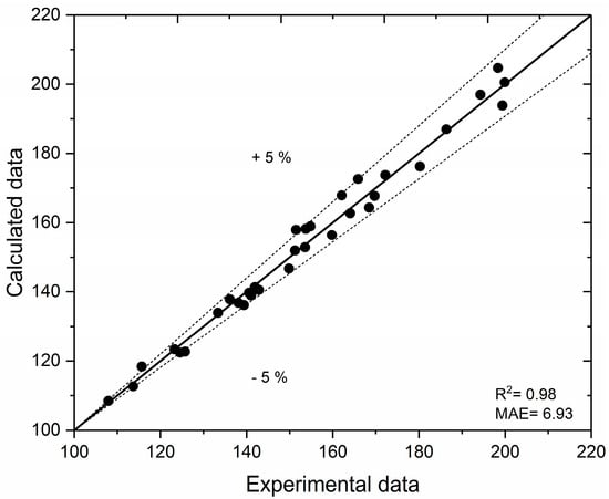 Parity plot of the predicted values of the extraction polyphenolic yield. R2—Coefficient of Determination; MAE—Mean Absolute Error.