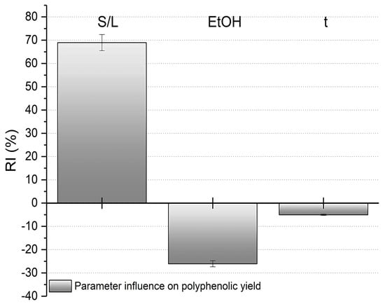 The successful creation of the ANN generated weight matrices that were used to determine the relative importance of the operating parameters and their effects (positive or negative) on polyphenolic yield (see Equation (1)). Figure 4 shows that the solid-to-liquid ratio had the greatest influence, accounting for 68.95% of the polyphenolic yield. The ethanol concentration was the second most influential parameter (26.03%), while time had a minor effect of 5.02%. The negative effect of these parameters on the polyphenolic yield indicated that as they increased, the polyphenolic yield decreased—an undesirable outcome that conflicts with the goal of maximizing phenol extraction. Based on Figure 4, it can be inferred that the extraction process is economically feasible since time had a minor influence on the yield, reducing both the time and energy consumption of the experiments.