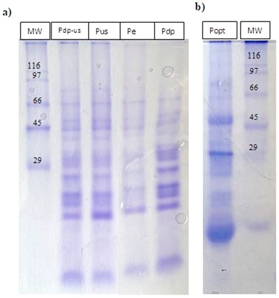 These findings were supported by SDS-PAGE analysis. PIs exhibiting higher solubility (Popt, P dp-us, and Pdp) displayed intense bands below 29 kDa, probably associated with napin fractions due to their higher solubility. In contrast, the enzyme-pretreated isolate (Pe) had more pronounced bands around 45 kDa, corresponding to cruciferin fractions (complex quaternary structure) that show limited solubility [48].