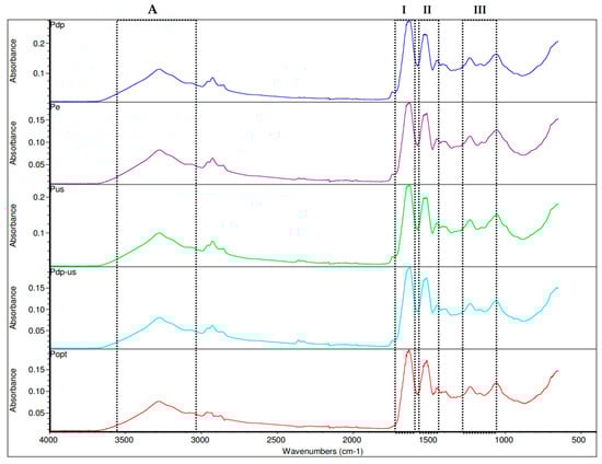 The protein extraction yields ranged from 17.57% to 30.99%, with the following order of yields: Pdp-us > Pus > Pdp > Pe (Figure 2). The Pdp-us method resulted in the highest extraction yield, with a 44.5% increase in yield compared to Pdp. These results suggest that ultrasonic treatment combined with ethanol washing is highly efficient in releasing bound proteins from the protein–phenol complexes, allowing for faster extraction compared to conventional alkaline extraction. The combination of alkaline extraction and physical processing techniques, such as ultrasound and ethanol washing, provides a promising and cost-effective approach that significantly increases extraction efficiency and enables scalability of the process.