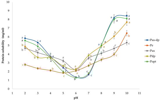 The solubility profile (pH dependent profile) of PIs obtained through different extraction methods. Values represent means of three independent determinations ± standard deviation. Different letters next to the data points indicate statistically significant differences at p ≤ 0.05, with each color corresponding to a specific treatment.